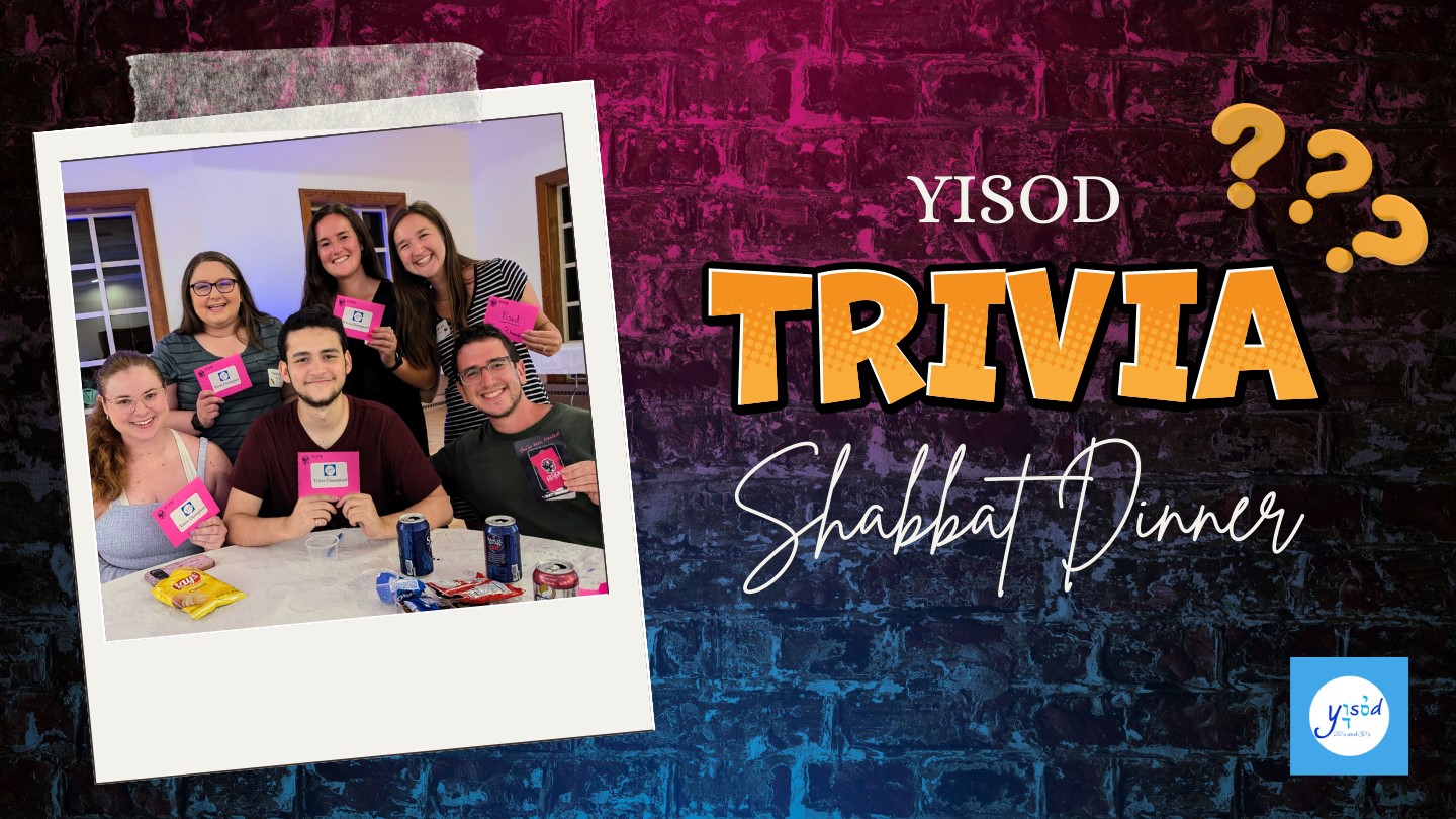 Yisod Trivia returns at this energetic Shabbat Dinner! Our resident Trivia Master Adam Rabinowitz is back, with questions sure to make you scour the edges of your brain as you complete with other tables to come out on top and win the trophy! Grab a drink, meet your team, eat dinner, and get ready for a night of fun!